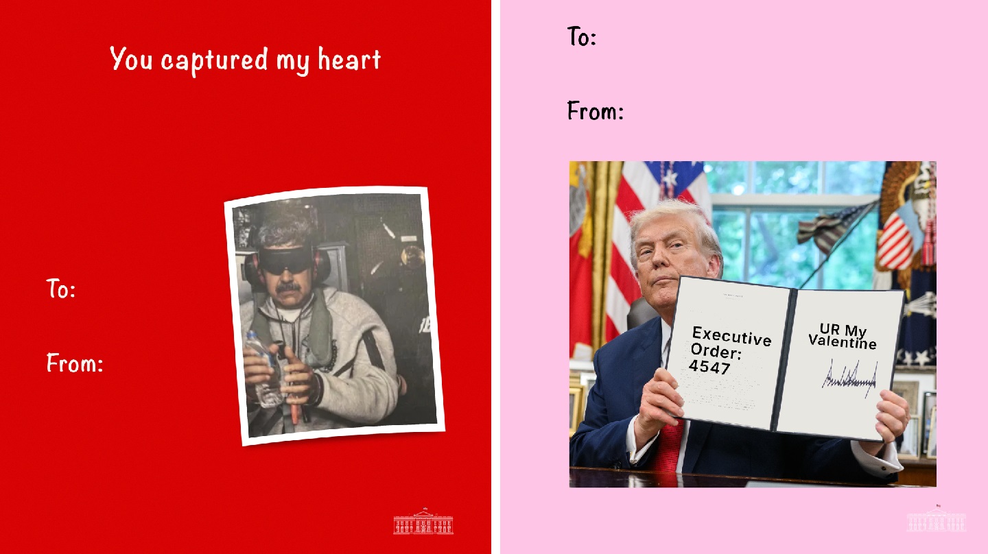 بەشێوەیەکی گاڵتەجاڕانە، کۆشکی سپی بەشێوازی تایبەتی خۆی یادی ڤالانتاینی کردۆتەوە و کارتی بۆ نیکۆلاس مادۆرۆ سەرۆکی زیندانیکراوی ڤەنزوێلا و جۆ…